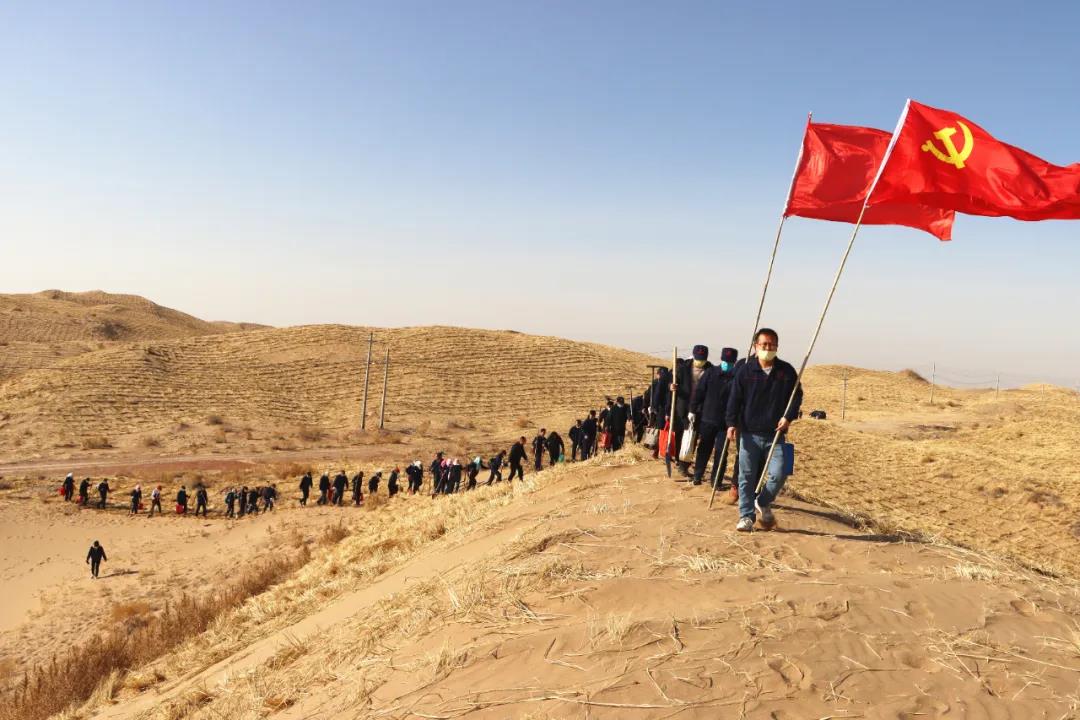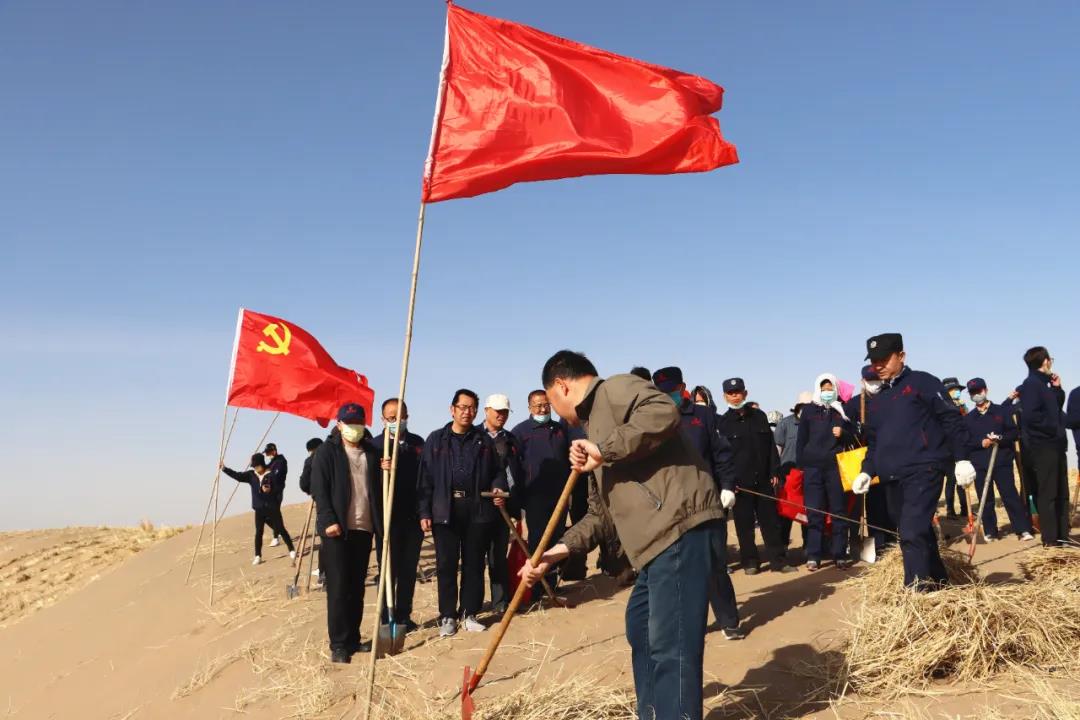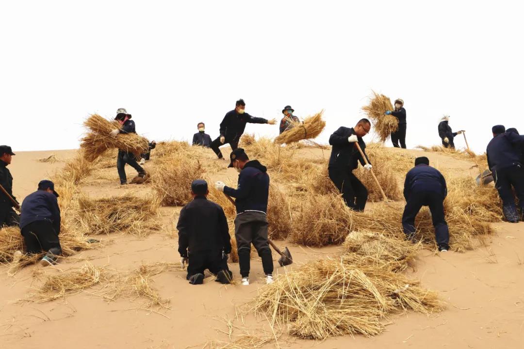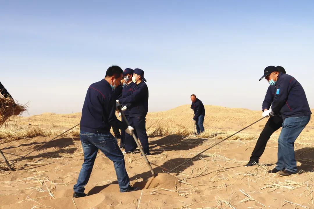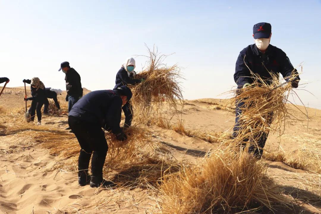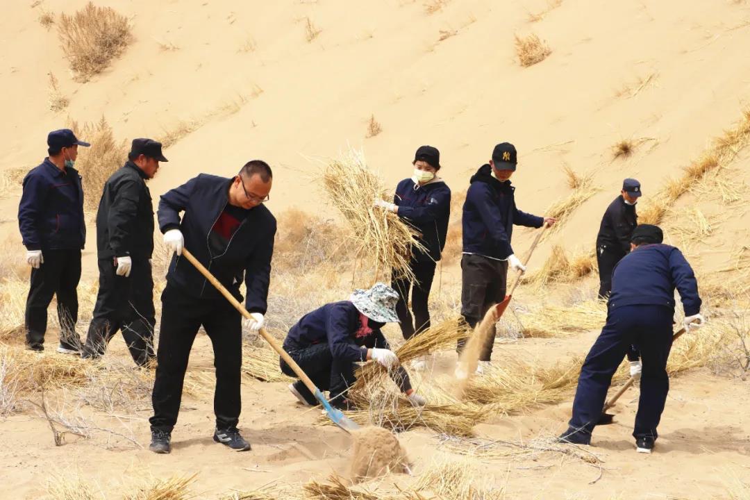 一大早,職工們在皇臺酒業(yè)總經(jīng)理?xiàng)罾膸ьI(lǐng)下,精神飽滿地趕赴至涼州區(qū)榮生路紅水河榮華大橋向東21公里處的治沙現(xiàn)場。