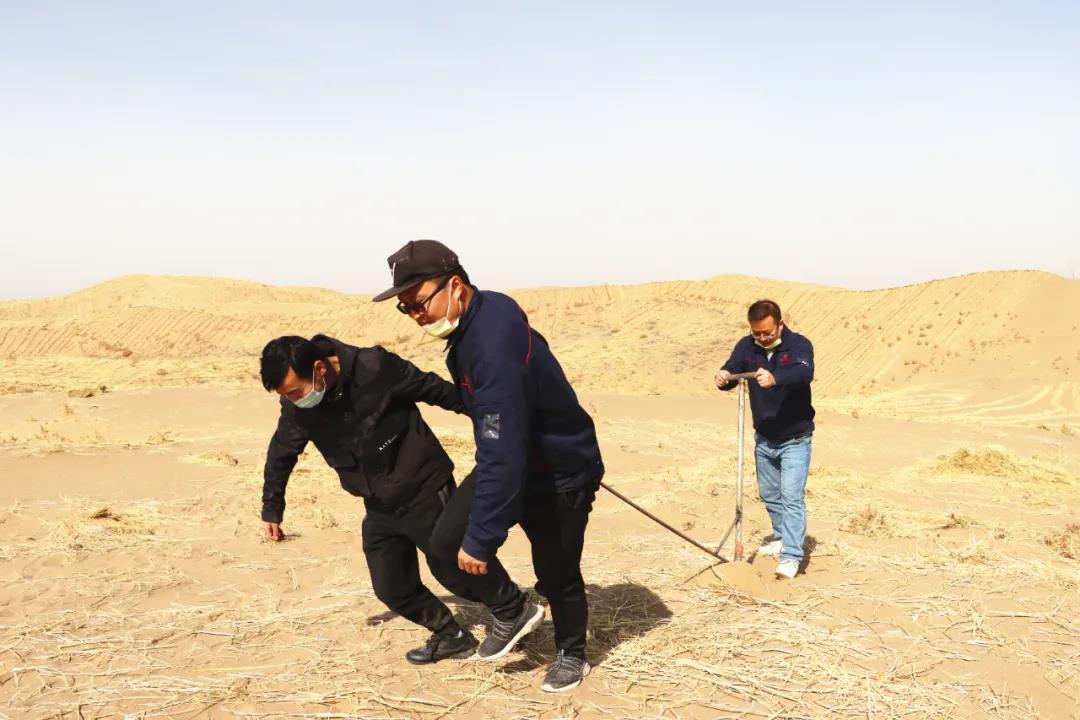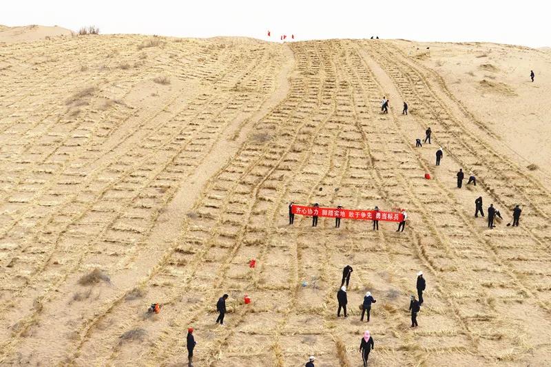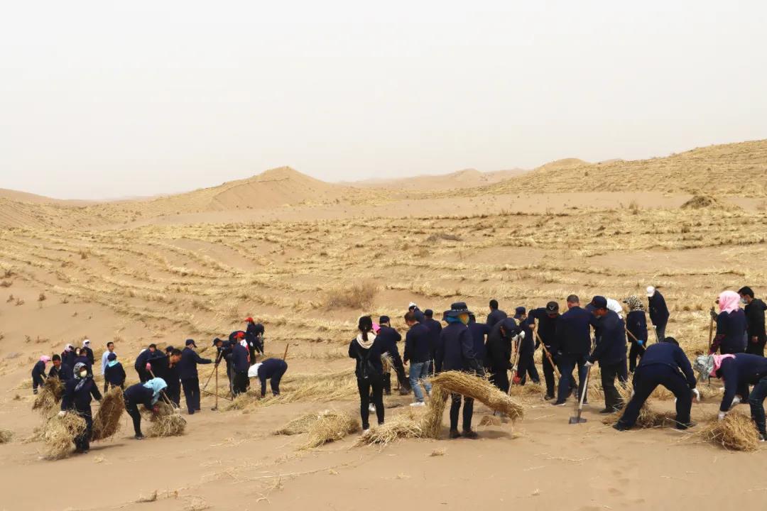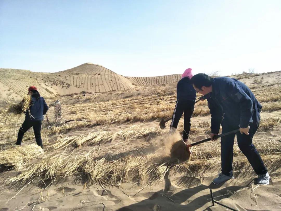 “壓沙前,先要在沙丘上按設(shè)置方向、間距或網(wǎng)格劃好設(shè)置線。背風(fēng)坡,壓豎道;迎風(fēng)坡,就要橫豎格子全壓。先開寬25厘米、深20厘米的沙溝,將稻草在沙溝上均勻無間斷鋪好,再將沙子壓實(shí)在稻草中間,將兩邊翹起的稻草用沙淤起與沙面垂直,扶成“雙眉式”……大家仔細(xì)聆聽了區(qū)林草局技術(shù)人員的詳細(xì)講解和指導(dǎo)后,很快掌握了規(guī)范的壓沙方法和要求,各小組迅速投入到熱火朝天的防沙壓沙活動中。