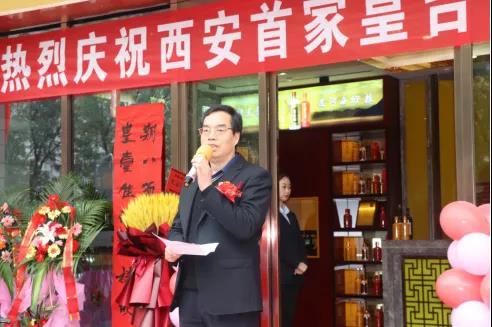 開業儀式第二項由陜西帝萃商貿有限公司總經理高雪偉先生致賀辭,他表示作為酒業同仁,對皇臺酒也有深入了解,希望皇臺酒搶抓市場機遇,借助專營店的優勢,擴大銷售規模,做好產品推廣和文化傳播,為消費者提供輕松舒適的購酒體驗,并?;逝_酒專營店開業大吉,財源滾滾。