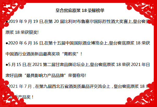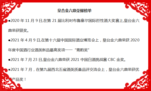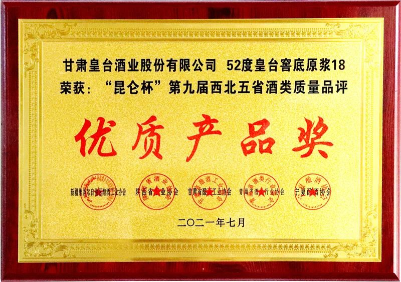 西北五?。▍^)協會于 2021 年 7 月 17—20 日在新疆維吾爾自治區喀什市召開了“西北五省(區)第九屆酒類質量品評交流會”,在此交流會上,皇臺窖底原漿18和皇臺金六鼎分別捧獲優質產品獎和優秀產品獎!