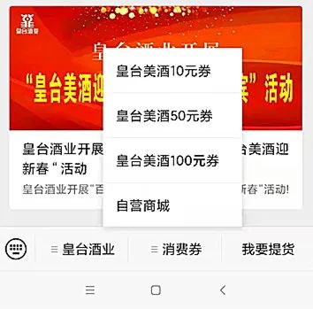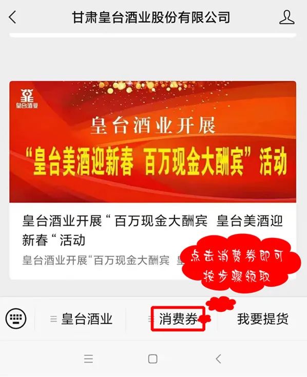 1.第一步關注“皇臺酒業”公眾號后,點擊下圖中的“消費券,即可開啟搶購。