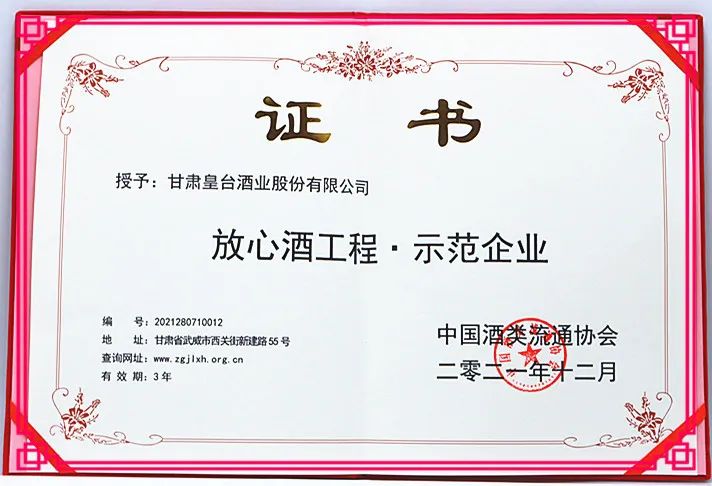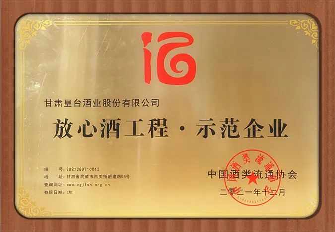 質量是一個企業的生命線,“以質量求生存,”是皇臺酒業至始至終的發展理念?;逝_曾連續多年榮獲甘肅省名牌產品稱號,被中國質量萬里行市場調查中心授予“國家監督檢查產品質量知名品牌”,被中國質量檢驗協會授予“全國質量檢驗合格穩定產品”稱號。公司為確保產品質量安全為首要任務,實施各層級、各崗位嚴格管理,建立并完善全員、全過程、全方位的質量管理體系。始終把誠信作為企業立足的基石,實實在在釀糧食酒、放心酒、安全酒。 此次,皇臺酒業被中國酒類流通協會授予“放心酒工程·示范企業”等榮譽,不僅證明了皇臺酒業產品的優質,體現了行業及消費者對企業的認可和支持,而且也彰顯了皇臺酒業不忘初心,主動作為,勇于擔當的社會責任心。