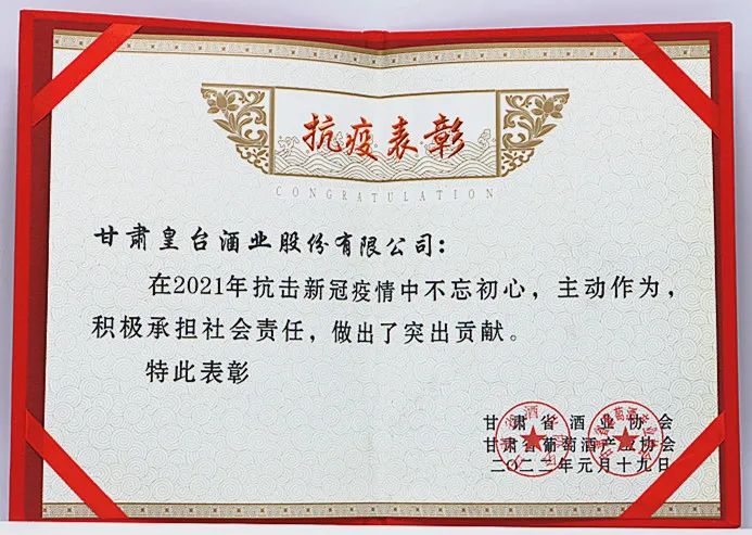 2022年1月25日,為迎接新的奮斗征程、激發新的發展動力,搭建好交流學習、互通有無、資源對接的服務平臺,更好地推動全省酒類行業的健康有序發展,甘肅省酒業協會舉辦“迎新春聯誼會暨表彰大會”。大會上,甘肅皇臺酒業股份有限公司被中國酒類流通協會授予2021年中國酒類流通協會放心酒工程示范企業,甘肅日新皇臺酒銷售有限公司直營配送中心·皇臺酒業直營店被授予2021年中國酒類流通協會放心酒工程示范店。公司董事、總經理代繼陳代表公司上臺領獎。