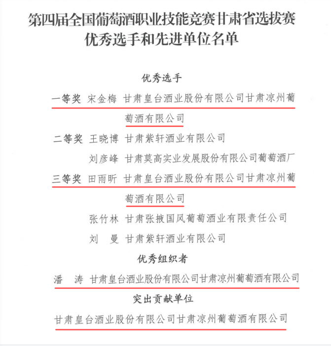 近日,甘肅省釀酒工業協會和甘肅省經貿工會工作委員會聯合下發了《關于第四屆全國葡萄酒職業技能競賽甘肅省選拔賽優秀選手和先進單位的通報》,對在全國決賽和甘肅省選拔賽中成績優異選手、優秀組織者以及為技能競賽作出突出貢獻的甘肅皇臺酒業股份有限公司甘肅涼州葡萄酒有限公司予以通報表彰。