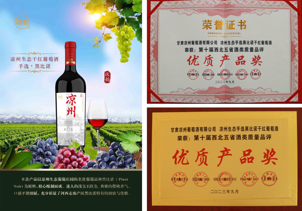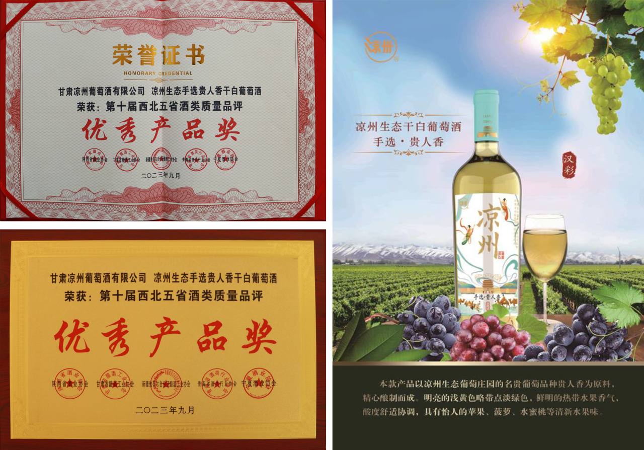 皇臺酒業旗下甘肅涼州葡萄酒有限公司的葡萄酒產品,也在本次品評會上大放異彩。「涼州生態手選貴人香干白葡萄酒」以其醇厚的口感和豐富的層次感贏得了評委們的高度贊譽,榮膺“優秀產品獎”,而另一款葡萄酒「涼州生態手選黑比諾干紅」同樣憑借其飽滿回甘的口感,榮膺“優質產品獎”。這兩款葡萄酒無疑充分展示了皇臺酒業在葡萄酒釀造領域的精湛技藝。