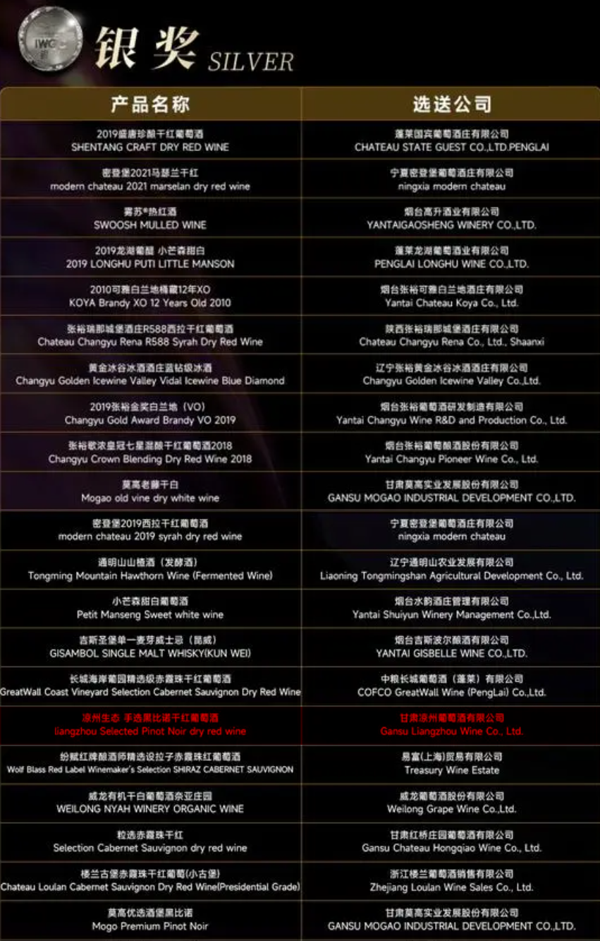 11月18日,2023IWGC國際葡萄酒(中國)大獎賽頒獎儀式在海南·海口國際會展中心隆重舉行。IWGC國際葡萄酒(中國)大獎賽匯聚國內外酒款,參賽企業覆蓋國內17個省份和法國、德國、澳大利亞、智利等多個國家的優質產區,參評產品達到537款,包含葡萄酒、白蘭地、威士忌、果酒、配制酒、露酒六個品類。在此次大賽上,皇臺酒業旗下的甘肅涼州葡萄酒有限公司所生產的“涼州生態·手選貴人香干白葡萄酒”和“涼州生態·手選黑比諾干紅葡萄酒”,以優異的品質在激烈的角逐中脫穎而出,分別斬獲了金獎和銀獎。