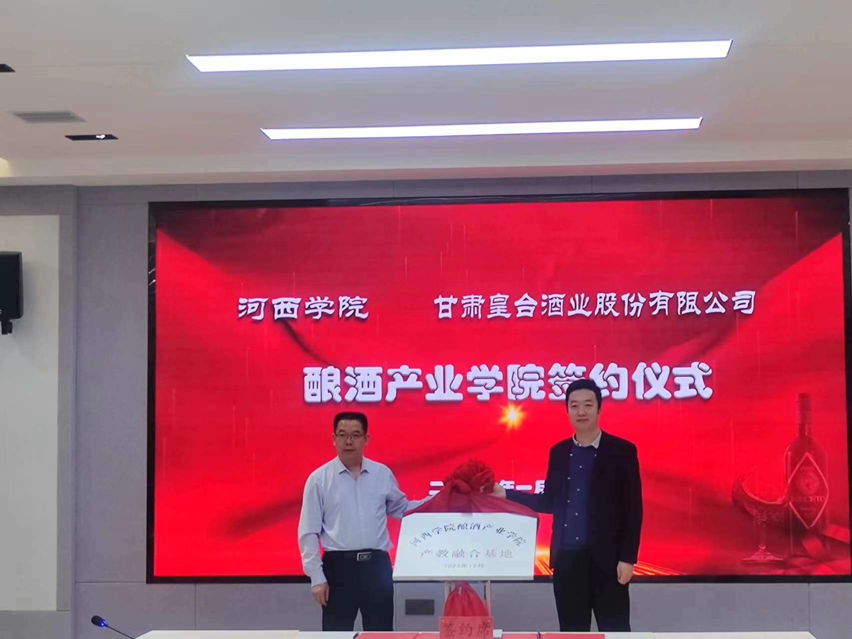 1月5日,河西學院與皇臺酒業等省內其他幾家酒企共同舉行了河西學院釀酒產業學院簽約及揭牌儀式。河西學院黨委副書記、校長周勇代表學校與皇臺酒業等酒企簽訂了合作協議并揭牌。