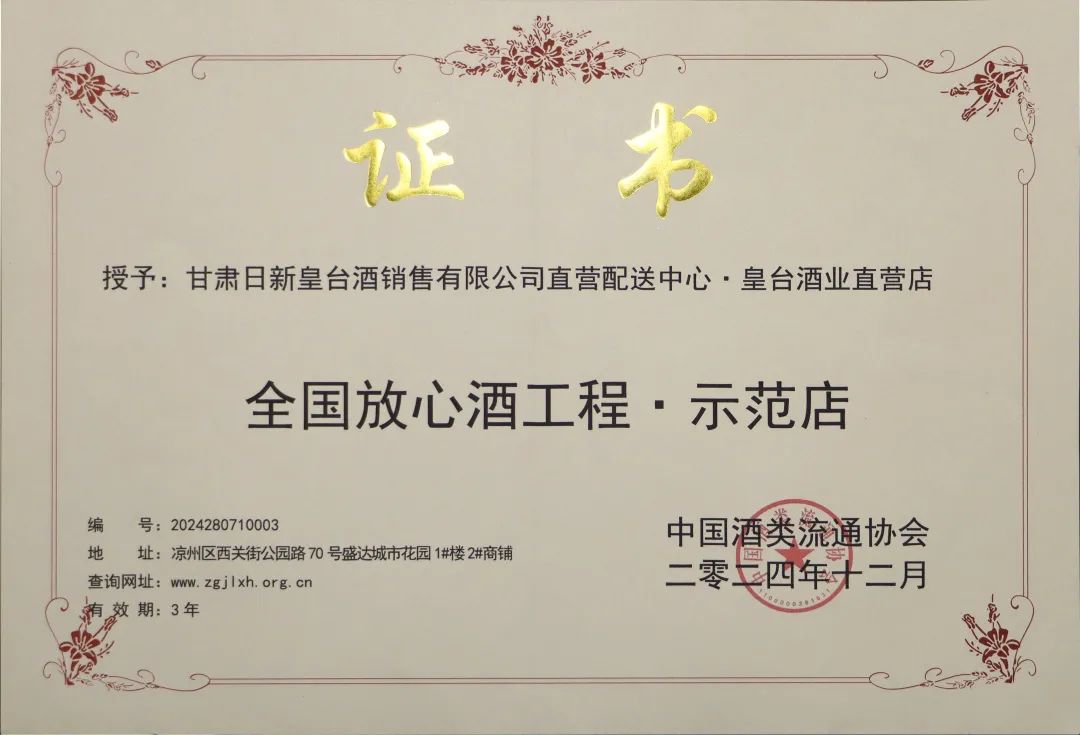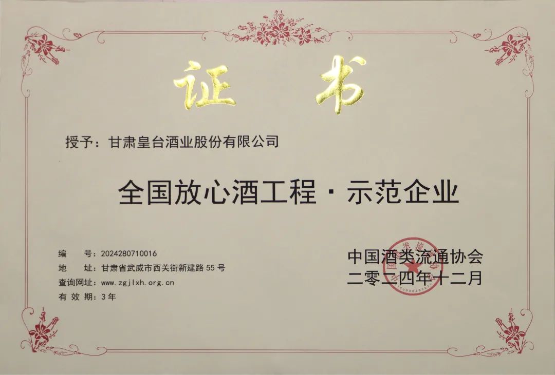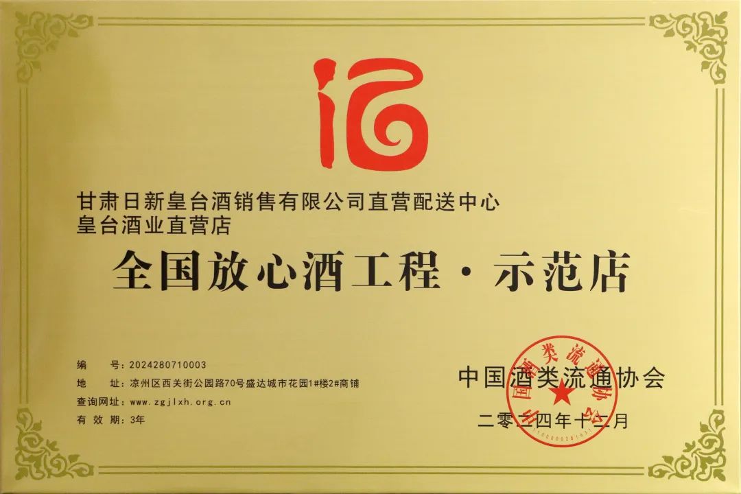 12月中旬,2024年中國(guó)酒類流通協(xié)會(huì)公布了全國(guó)放心酒工程示范企業(yè)(店)名單,甘肅皇臺(tái)酒業(yè)股份有限公司憑借優(yōu)異的品質(zhì)和信譽(yù),成功榮獲了全國(guó)放心酒工程·示范企業(yè)殊榮。與此同時(shí),甘肅日新皇臺(tái)酒銷售有限公司直營(yíng)配送中心也因其優(yōu)質(zhì)的服務(wù)和管理,榮獲了全國(guó)放心酒工程·示范店稱號(hào)。