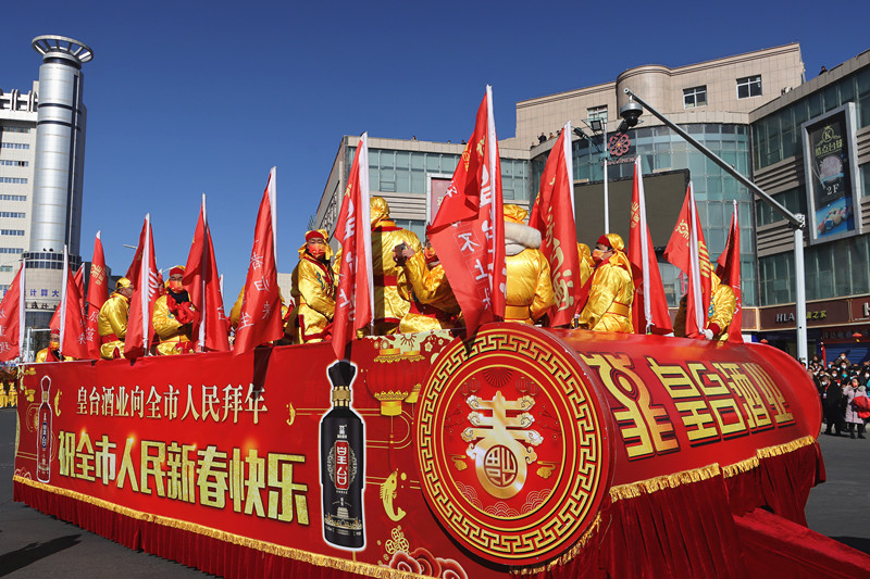 皇臺巨龍,威風八面,神采飛揚,在廣大圍觀群眾的注目下,一路噴灑著醇香的皇臺酒,酒香醉美了涼州城。 社火展演當日,涼州城人山人海,道路兩旁,站滿了看社火的人群。尤其皇臺巨龍經過,總掀起一片集體的贊嘆聲和唏噓聲,更掀起了廣大市民現場觀賞社火的高潮?;逝_巨龍已成涼州社火重要的組成部分,更成為家鄉父老春節的最深記憶。
