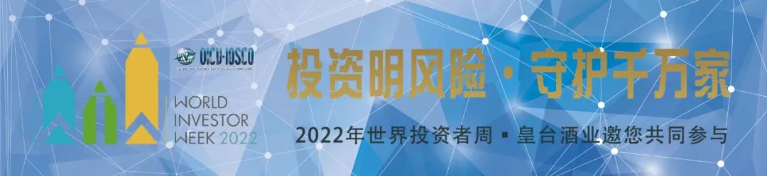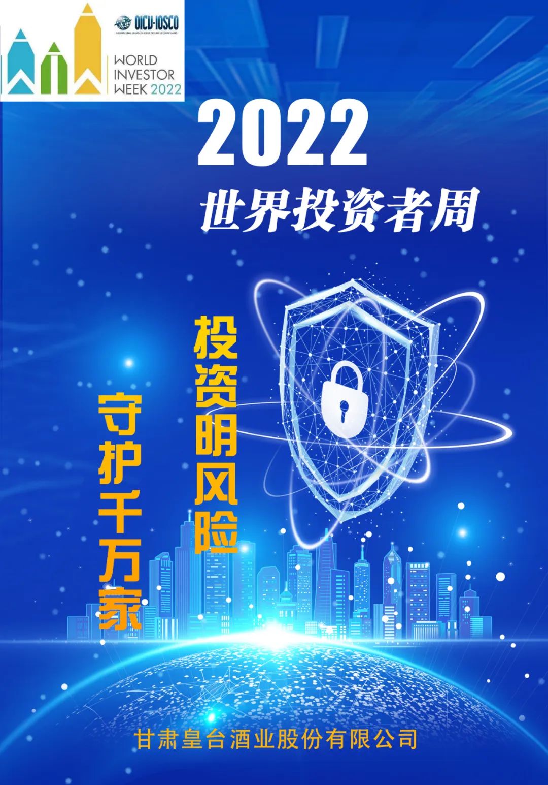 2022年10月8日-14日為“2022年世界投資者周”,本次活動主題為“投資明風險,守護千萬家”。為貫徹落實監管部門投資者保護工作的部署要求,加強投資者教育保護的國際交流合作,積極響應“2022年世界投資者周”活動號召,皇臺酒業在監管部門的指導下,將以“投資明風險,守護千萬家”為主題,開展投資者教育和保護宣傳,面向投資者做好證券基金期貨知識宣傳普及,引導投資者學習金融知識,樹立正確投資理念!